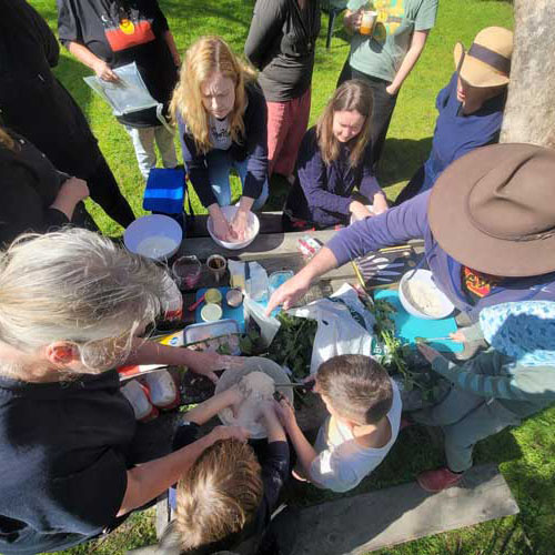 Aunty Jo Russell led a hands-on bush tucker workshop at Allwood, sharing her Wiradjuri knowledge, native plant uses, and delicious damper and pickled pigface making with a warmly engaged community group