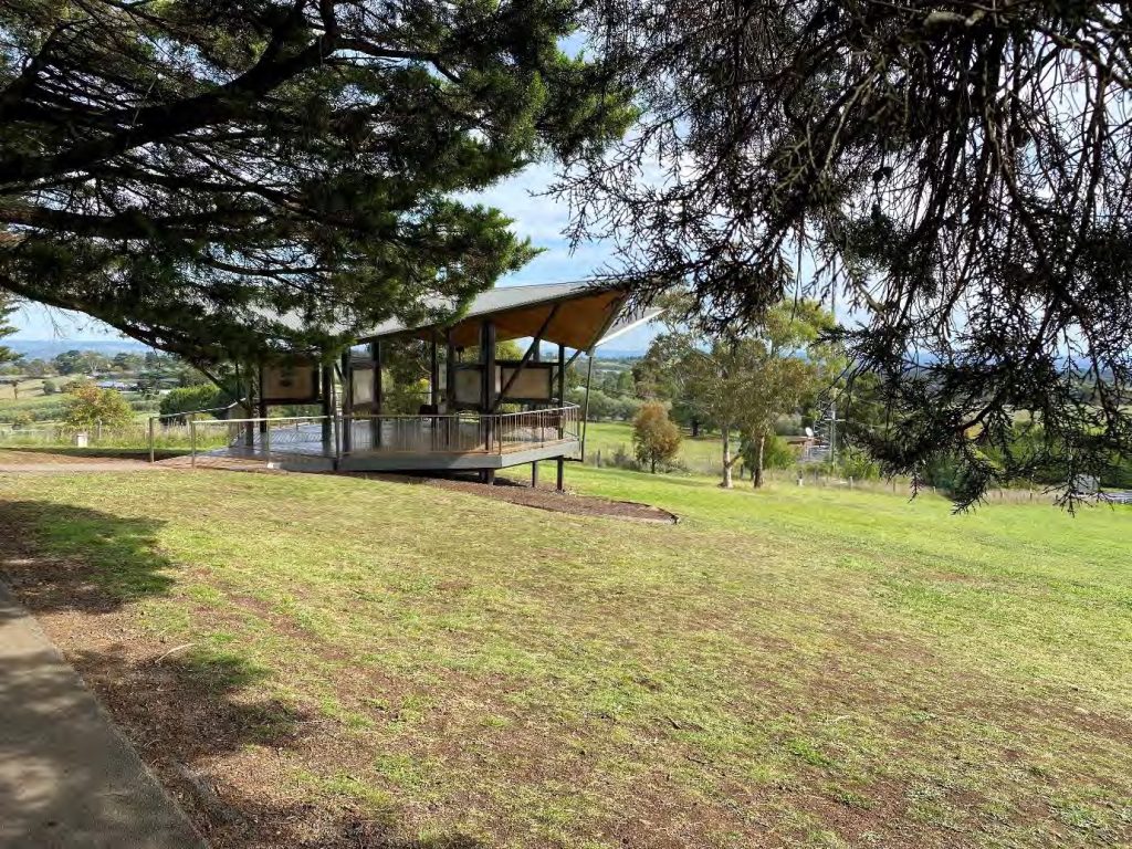 The platform provides shelter for people visiting the park whilst also giving stunning panoramic views without people needing to negotiate the stairs of the lookout tower. From the platform you can see the Dandenongs, the city of Melbourne, the You Yangs, Mount Macedon, the Kinglake Ranges and the Mt Baw-Baw Ranges where the Yarra River starts. This landscape covers all the ancestral lands of the Wurundjeri and some of the wider Kulin nation land.